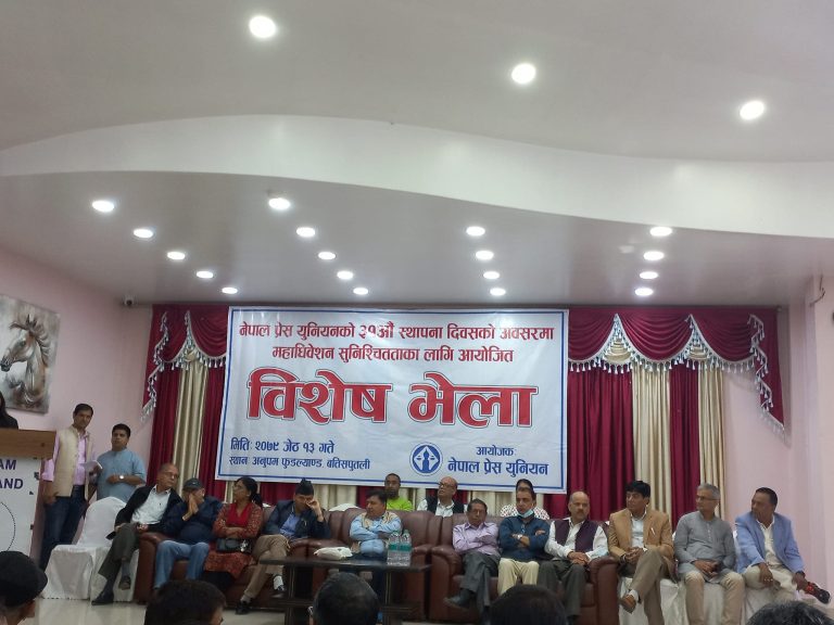 काठमाडौं । लोकतन्त्रवादी पत्रकारहरूको साझा संस्था नेपाल प्रेस युनियन विभाजनको संघारमा पुगेको छ । जेठ १३ र १४ गते हेटौंडामा गर्ने भनिएको नवौं महाधिवेशनको मिति भदौमा सारिएपछि असन्तुष्ट भएको एउटा खेमाले शुक्रबार बत्तीसपुतलीस्थित अनुपम फुडल्यान्डमा विशेष भेला आयोजना गरेको थियो । भेलाले युनियनको नवौं महाधिवेशन २८ र २९ जेठमा काठमाडौंमा गर्ने निर्णय गरेको छ ।