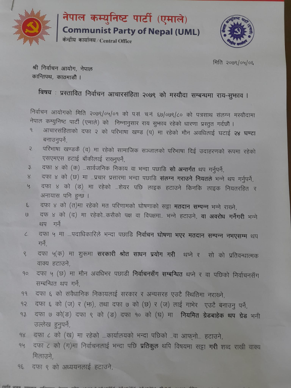 काठमाडौं । नेकपा एमालेले आगामी निर्वाचनका लागि आचारसंहिता बनाउन ३७ बुँदे प्रस्ताव गरेको छ ।