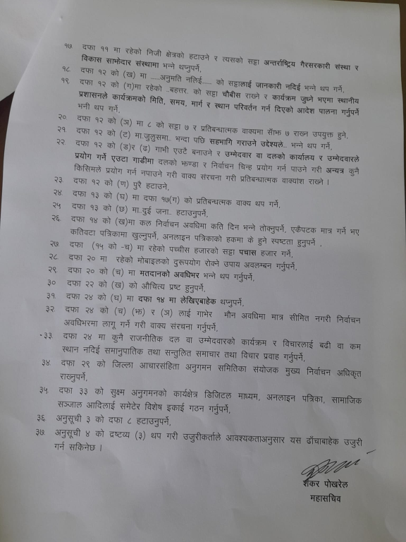 आयोगले सोमबार आचारसंहितामाथि दलहरुको राय सुझाव लिएको थियो । एमाले महासचिव शंकर पोखरेलले हस्ताक्षर गरेर आयोगलाई बुझाएको ३७ बुँदे प्रस्तावको पहिलो बुँदा मौन अवधि २४ घण्टा बनाउनुपर्ने उल्लेख छ ।