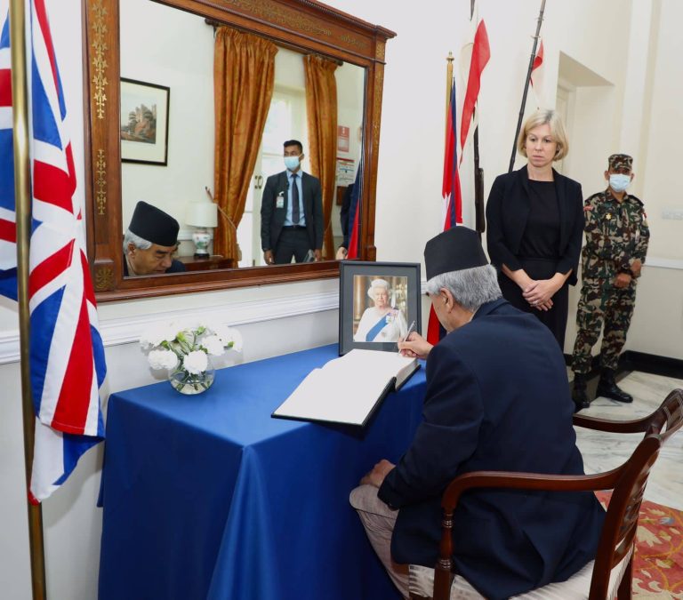साथै, प्रधानमन्त्री देउवाले दूतावासमा राखिएको शोक पुस्तिकामा शोक सन्देश पनि लेखेका छन् । महारानी एलिजावेथ द्धितीयकोे बिहीबार ९६ वर्षको उमेरमा निधन भएको थियो । उनको निधनप्रति विश्व नेताहरुले समवेदना व्यक्त गरेका छन् ।