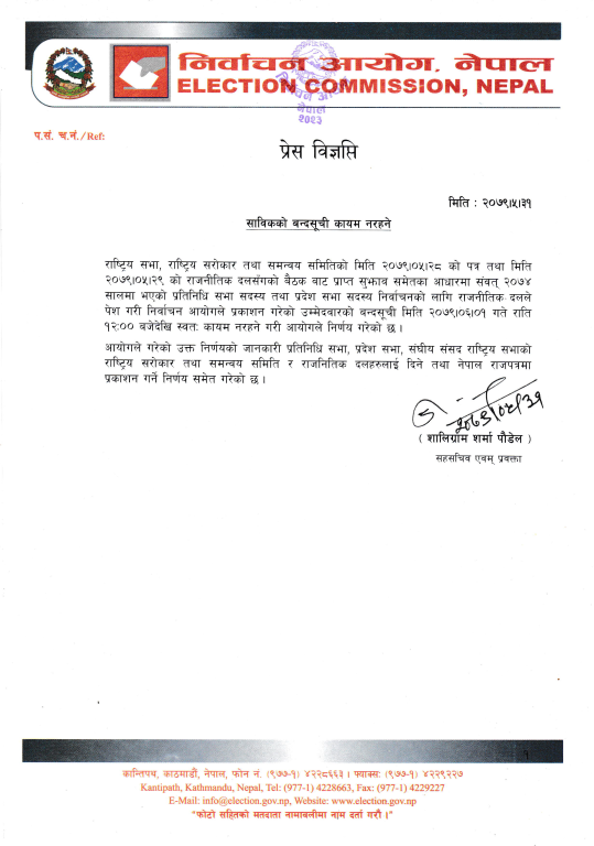 ‘आयोगले गरेको उक्त निर्णयको जानकारी प्रतिनिधि सभा, प्रदेश सभा, संघीय संसद राष्ट्रिय सभाको राष्ट्रिय सरोकार तथा समन्वय समिति र राजनितिक दलहरुलाई दिने तथा नेपाल राजपत्रमा प्रकाशन गर्ने निर्णय समेत गरेको छ,’ विज्ञप्तिमा भनिएको छ ।