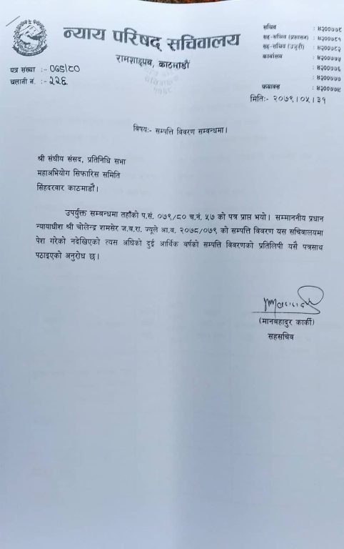 समितिले बिहीबार सम्पत्ति विवरण झिकाउने निर्णय गरेको थियो । शुक्तबार न्याय परिषदले महाभियोगबारे छानबिनका क्रममा प्रमाणका रुपमा महाभियोग सिफारिस समितिलाई चोलेन्द्रको सम्पत्ति विवरण उपलब्ध गराएको हो । न्याय परिषद्ले २०७८ साउनसम्म जबराको नाममा बैंक अफ काठमाडौंमा ५९ लाख २६ हजार रुपैयाँ नगद उल्लेख रहेको जनाएको छ ।