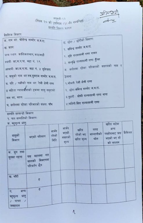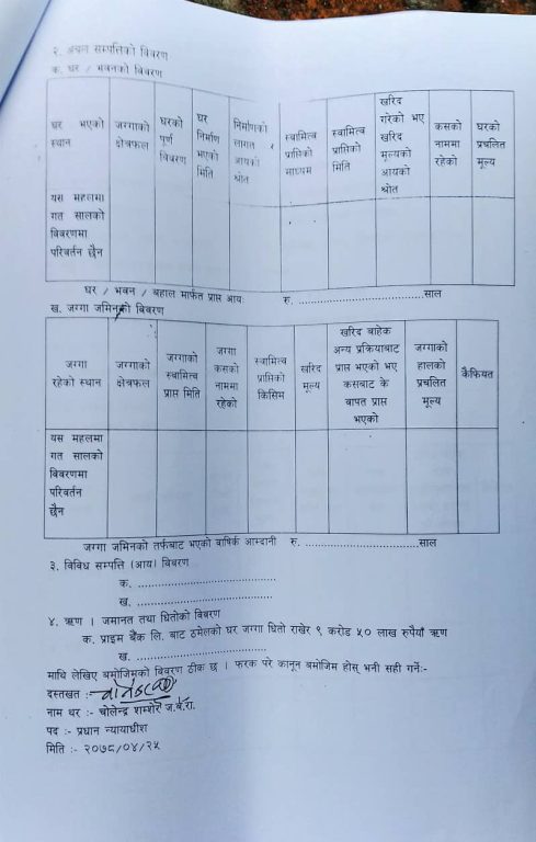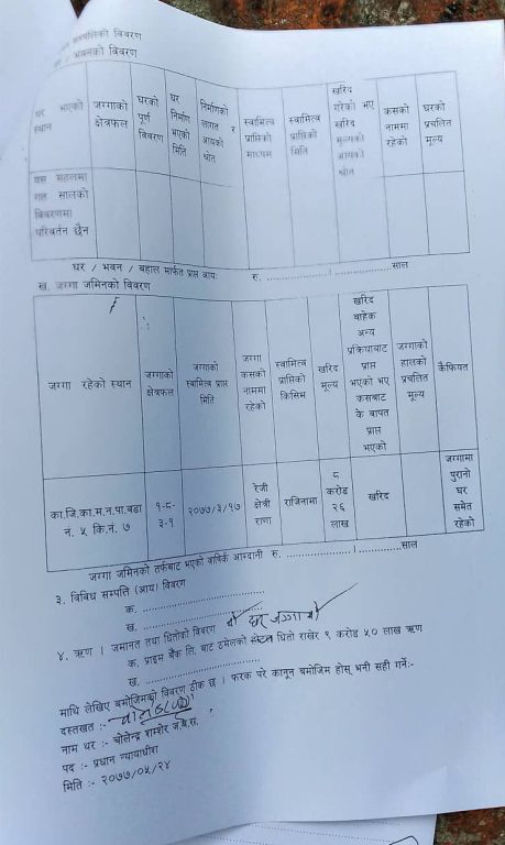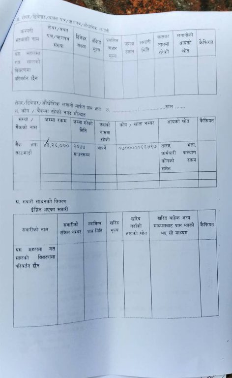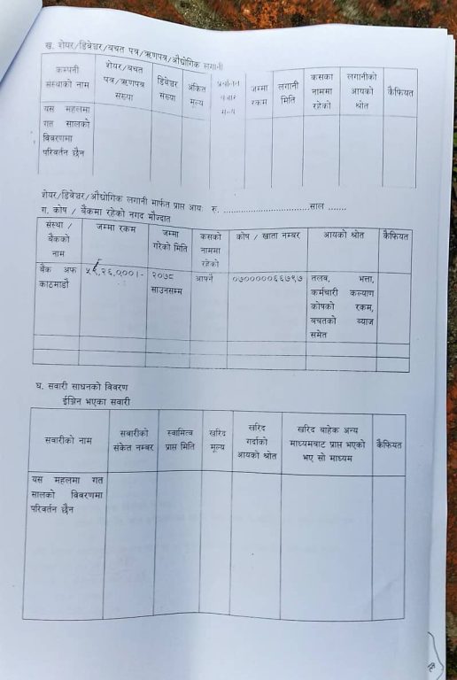 त्यस्तै ठमेलको घरजग्गा धितोमा राखी ९ करोड ५० लाख ऋण लिएको विवरणमा उल्लेख छ । त्यस्तै सम्पत्ति विवरणमा पुरानै विवरण उल्लेख भएको जनाइएको छ । साथै गरगहना पनि विवरणमा उल्लेख गरिएको छैन ।