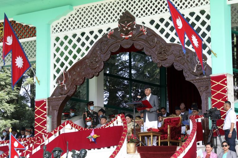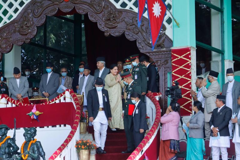 काठमाडौँ । संविधान दिवसको अवसरमा टुँडिखेलमा आयोजित विशेष समारोहमा सहभागी हुँदै राष्ट्रपति विद्यादेवी भण्डारी, उपराष्ट्रपति नन्दबहादुर पुन, प्रधानमन्त्री शेरबहादुर देउवालगायत ।