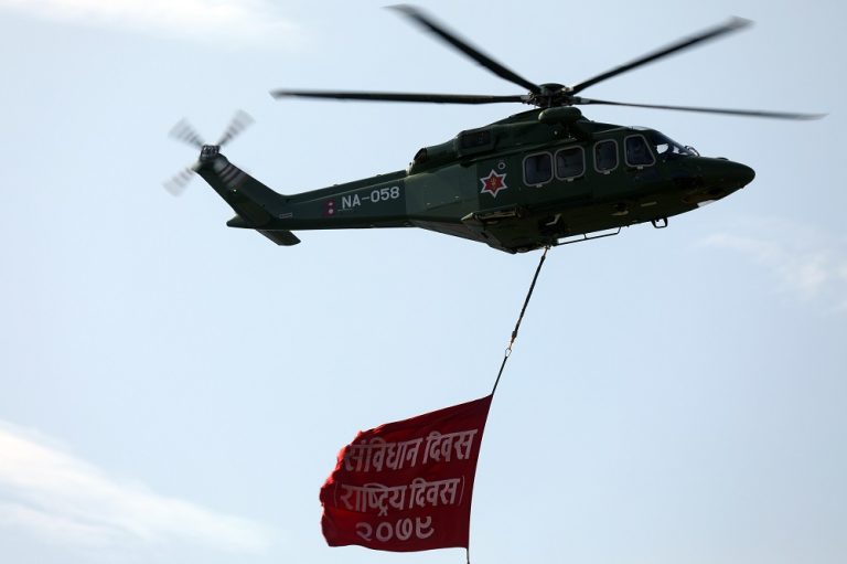 संविधान दिवसको अवसरमा टुँडिखेलमा आयोजित विशेष समारोहमा हेलिकोप्टरबाट संविधान दिवस २०७९ लेखिएको व्यानर झुण्डयाएर परिक्रमा गर्दै ।