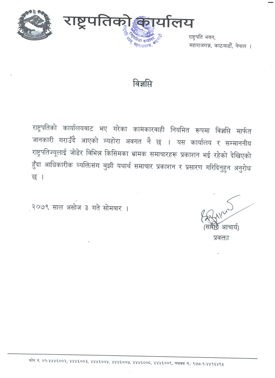 यस कार्यालय र सम्माननीय राष्ट्रपतिज्यूलाई जोडेर विभिन्न किसिमका भ्रामक समाचारहरू प्रकाशन भई रहेको देखिएको हुँदा आधिकारीक व्यक्तिसँग बुझी यथार्थ समाचार प्रकाशन र प्रसारण गरिदिनुहुन अनुरोध छ’ प्रवक्ता सागर आचार्यद्वारा जारी विज्ञप्तिमा उल्लेख छ।