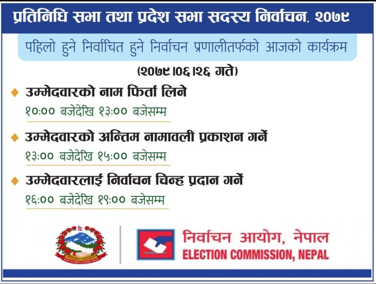 हिजो प्रकाशित नामावलीबाट नाम फिर्ता लिन चाहने उम्मेदवारका लागि आज १० वजे देखि १ बजेसम्मको समय दिइएको आयोगले जनाएको छ । आज १ वजेदेखि २ वजेसम्म अन्तिम नामावली प्रकाशित हुने निर्वाचन आयोगका प्रवक्ता शालिग्राम शर्मा पौडेलले जानकारी दिए । यसअघि हिजो आयोगले प्रतिनिधि सभा र प्रदेश सभा सदस्यको निर्वाचनको लागि मनोनयन दर्ता गरेका उम्मेदवार विरुद्ध परेको उजुरी उपरको छानबीन सकेर उम्मेदवारहरुको नामावली प्रकाशित गरेको थियो ।