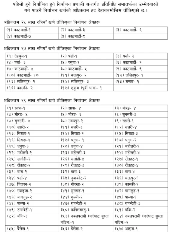 उल्लिखित भारका आधारमा पहिलो हुने निर्वाचित हुने निर्वाचन प्रणालीबमोजिम हुने प्रतिनिधि सभाको निर्वाचनमा काठमाडौँको निर्वाचन क्षेत्रहरु १, ३, ६, ७ र ८ मा निर्वाचन खर्चको हद २५ लाख कायम हुनेछ। यस्तै‚ १७ वटा निर्वाचन क्षेत्रमा २७ लाख, ६५ वटा निर्वाचन क्षेत्रमा रु।२९ लाख, ५२ वटा निर्वाचन क्षेत्रमा ३१ लाख र २६ वटा निर्वाचन क्षेत्रमा निर्वाचन खर्चको हद रु।३३ लाख कायम हुनेछ।