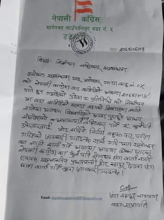 भागेश्वर गाउँपालिका–५ को नेपाली काँग्रेसको वडा समितिले मंसिर ४ मा हुने प्रतिनिधि सभा र प्रदेश सभा निर्वाचन बहिष्कार गर्ने निर्णय गरेको जानकारी दिएको छ ।