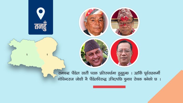 त्यसो त हरेक निर्वाचनमा तनहूँ चर्चाको शिखरमा हुन्छ । नेपाली कांग्रेसका बरिष्ठ नेता रामचन्द्र पौडेल तनहूँबाट सातौँ पटक चुनावी मैदानमा हुनुहुन्छ । यति मात्र होइन कुनैबेला पौडेलकै सहकर्मी गोविन्दराज जोशी अहिले पौडैलसँगै चुनावी प्रतिस्पर्धामा छन् । त्यसैले पनि यहाँको निर्वाचन अलि रोचक बनेको छ। तनहूँ–१ बाट पौडेलसँगै नेता जोशी र एमालेका एकबहादुर राना चुनावी प्रतिस्पर्धामा छन् ।