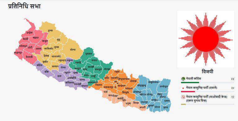 काठमाडौं । प्रतिनिधिसभामा १ सय ६५ सिटमा पहिलो हुने निर्वाचनमा नेकपा एमालेले झन्डै ४५ सिट जित्ने अनुमान गरिएको छ । यो समाचार तयार पार्दासम्म ३४ सिट जितिसकेको छ भने ११ स्थानमा अगाडि छ ।