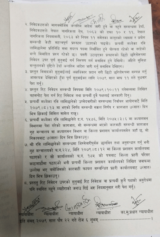 संवैधानिक इजलासले छिटो निरूपण गर्नुपर्ने विवाद भएकाले माघ ११ गतेलाई पूर्ण सुनुवाइको पेशी तोक्न आदेश गरेको हो । माघ ११ गतेसम्म रिट निवेदक र विपक्षी सबैले बहस नोट पनि पेश गरिसक्नुपर्ने सर्वोच्चको आदेशमा उल्लेख छ । आज अन्तरिम आदेश नदिए पनि आउँदा दिनमा सुनुवाइको पेशी तोक्दा अग्राधिकार अर्थात् प्राथमिकता दिनु भनिएकाे छ । साथै इजलाशले लामिछानेका नागरिकता र राहदानीसम्बन्धी कागजातहरू समेत सात दिनभित्र मगाएको छ ।