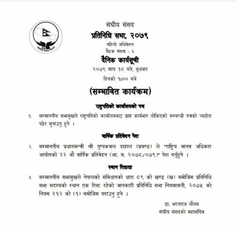 आजको बैठकमा सभामुखले राष्ट्रपतिको कार्यालयबाट प्राप्त कार्यभार तोकिएको सम्बन्धी पत्रको व्यहोरा पढेर सुनाउने, प्रधानमन्त्री पुष्पकमल दाहाल ‘प्रचण्ड’ले ‘राष्ट्रिय मानव अधिकार आयोगको २२ औं वार्षिक प्रतिवेदन (आव २०७८/०७९) पेस गर्ने सम्भावित कार्यसूची रहेको छ।