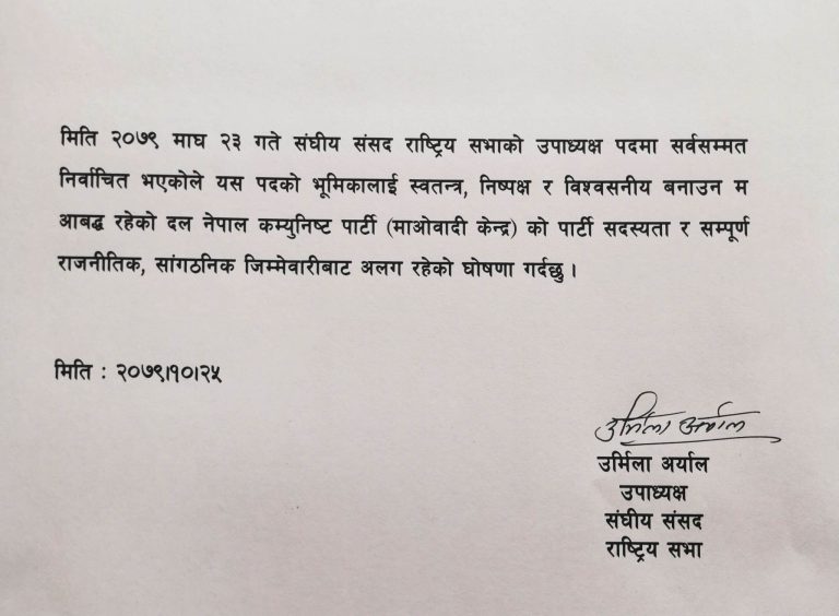 अर्यालले बुधबार जारी गरेको विज्ञप्तिमा उल्लेख छ, ‘राष्ट्रिय सभाको उपाध्यक्ष पदमा सर्वसम्मत निर्वाचित भएकोले यस पदको भूमिकालाई स्वतन्त्र, निष्पक्ष र विश्वसनीय बनाउन म आबद्ध रहेको दल नेकपा माओवादी केन्द्रको पार्टी सदस्यता र सम्पूर्ण राजनीतिक सांगठनिक जिम्मेवजारीबाट अलग रहेको घोषणा गर्दछु ।’