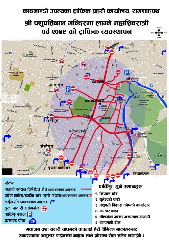काठमाडौं । महाशिवरात्रीका दिन पशुपति क्षेत्रमा हुने चहलपहललाई सहज बनाउन ट्राफिक प्रहरीले सवारी साधनको डाइभर्सन तोकेको छ ।