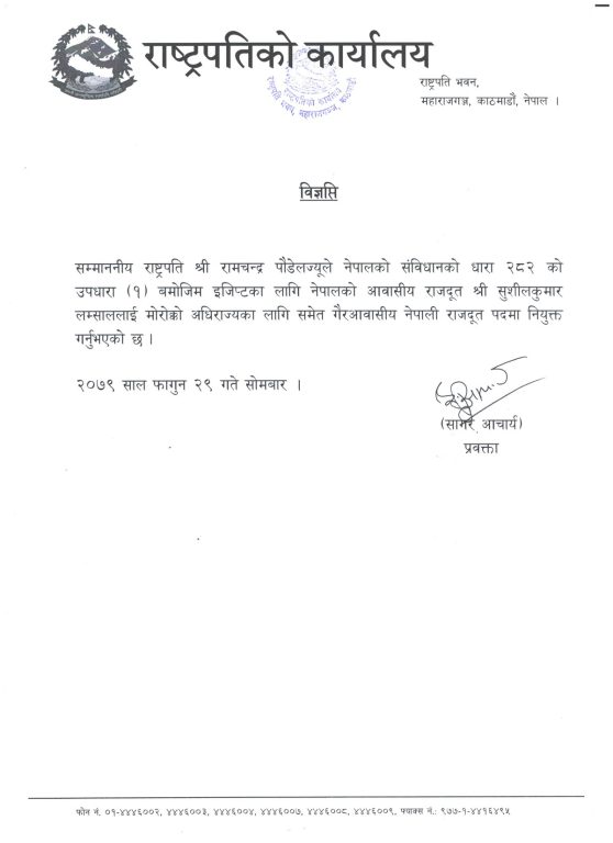 राष्ट्रपतिले गरे इजिप्टका लागि आवासीय राजदूत नियुक्त