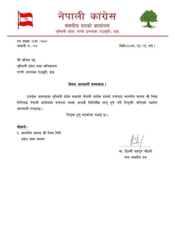 कांग्रेस लुम्बिनी प्रदेश सचेतकमा गिरी