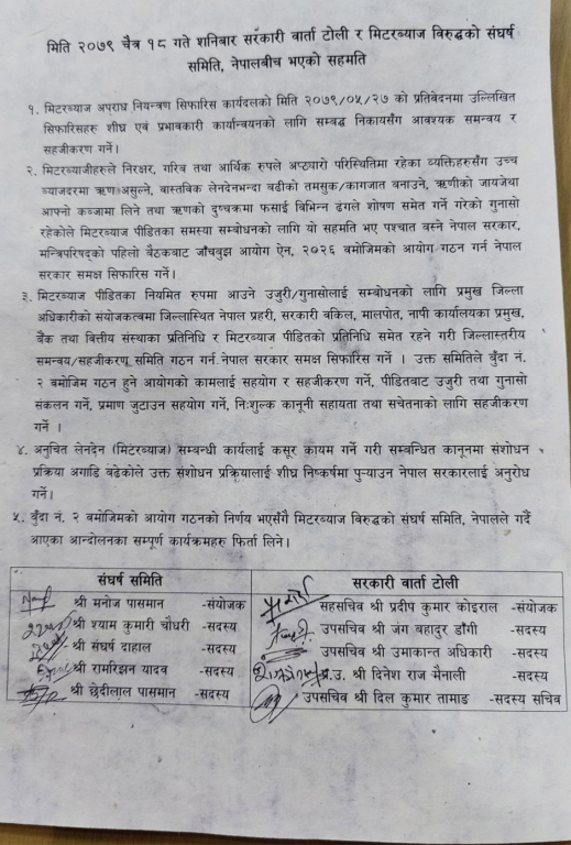 उपप्रधानमन्त्री तथा गृहमन्त्री नारायणकाजी श्रेष्ठलगायतको उपस्थितिमा सरकारी वार्ता टोली र संघर्ष समितिबीच सहमतिपत्रमा हस्ताक्षर भएको हो । सहमतिपत्रमा मिटरब्याज अपराध नियन्त्रण सिफारिस कार्यदलको २०७९ भदौ २७ को प्रतिवेदनमा उल्लेखित सिफारिस शीघ्र एवं प्रभावकारी कार्यान्वयनको लागि सम्बद्ध निकायसँग आवश्यक समन्वय र सहजीकरण गर्ने विषय उल्लेख गरिएको छ ।