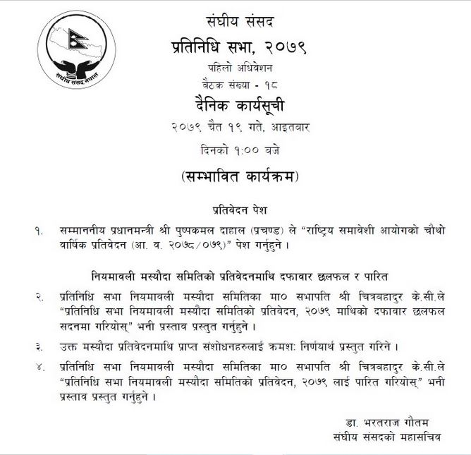 यस्तै, प्रतिनिधिसभा नियमावली मस्यौदा समितिका सभापति चित्रबहादुर केसीले ‘प्रतिनिधिसभा नियमावली मस्यौदा समितिको प्रतिवेदन, २०७९ माथिको दफावार छलफल सदनमा गरियोस्’ भनी प्रस्ताव प्रस्तुत गर्नेछन् । उक्त मस्यौदा प्रतिवेदनमाथि प्राप्त संशोधनहरूलाई क्रमशः निर्णयार्थ प्रस्तुत गरिनेछ ।