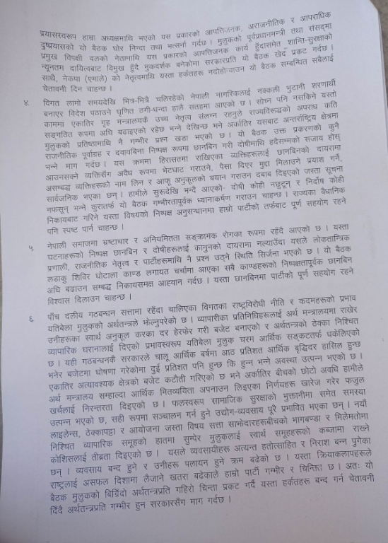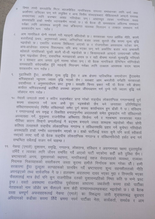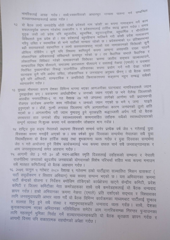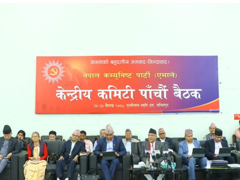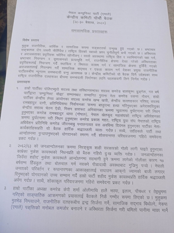 काठमाडौँ । नेकपा (एमाले)ले विभिन्न १६ समसामयिक प्रस्ताव पारित गरेको छ । ललितपुरको च्यासलस्थित कार्यकालमा बसेको केन्द्रीय कमिटीको पाँचौँ बैठकबाट ती प्रस्ताव पारित गरिएको हो ।