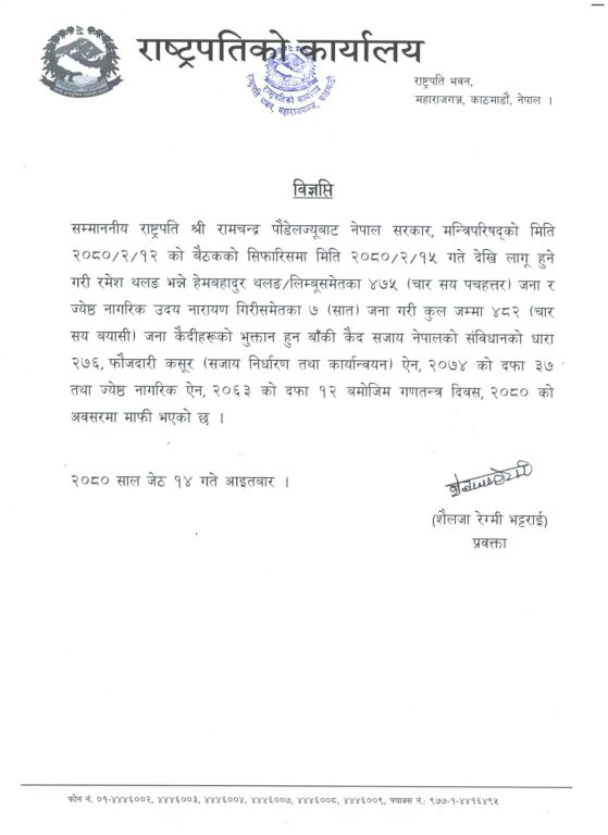 यस्तै ७ जना जेष्ठ नागरिकसहित ४८२ जनाको बाँकी कैद सजाय माफी भएको छ ।