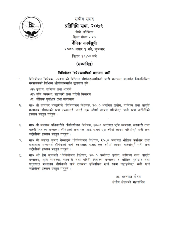 सङ्घीय संसद् सचिवालयका अनुसार आजको बैठकमा विनियोजन विधेयक २०८० अन्तर्गत उद्योग, वाणिज्य तथा आपूर्ति, भूमि व्यवस्था, सहकारी तथा गरिबी निवारण र भौतिक पूर्वाधार तथा यातायात मन्त्रालयमाथि छुट्टाइएको बजेटमा छलफल हुनेछ। यी मन्त्रालय सम्बन्धी विभिन्न प्रस्तावहरू पनि पेस गर्ने कार्यसूची रहेको छ ।