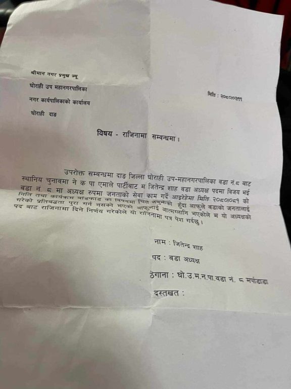 दाङ । घोराही उप-महानगरपालिका-८ का वडा अध्यक्ष जितेन्द्र शाहले पदबाट राजीनामा दिएका छन् । बजेटको विषयमा असन्तुष्टि जनाउँदै वडा अध्यक्ष शाहले मंगलबार पदबाट राजीनामा दिएका हुन् ।