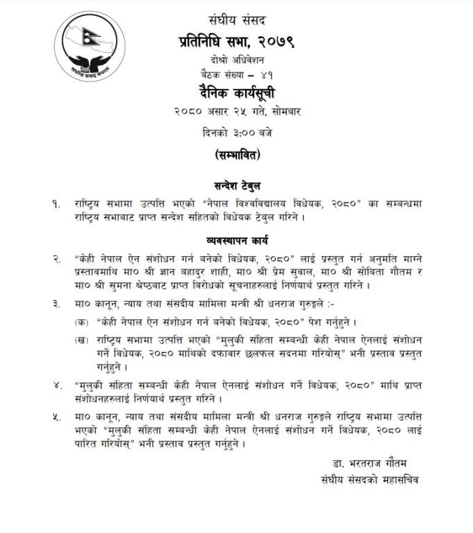 र, आजै सो बिद्येयक माथी संसोधनहरुलाई निर्णयार्थ प्रस्तुत गरिने सम्भावित कार्यसुचीमा राखेको संसद सचिवालयलले मुलुकी संहिता सबन्धी बिद्येयक पारित गर्ने प्रस्ताव प्रस्तुत हुनेछ ।