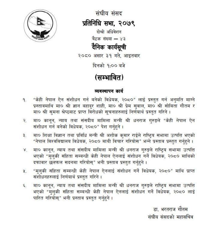 आजको बैठकमा केही नेपाल ऐन संशोधन गर्न बनेको विधेयक २०८० लाई प्रस्तुत गर्न अनुमति माग्ने प्रस्तावमाथि सांसदहरुबाट प्राप्त विरोधको सूचनालाई निर्णयार्थ प्रस्तुत गरिनेछ ।