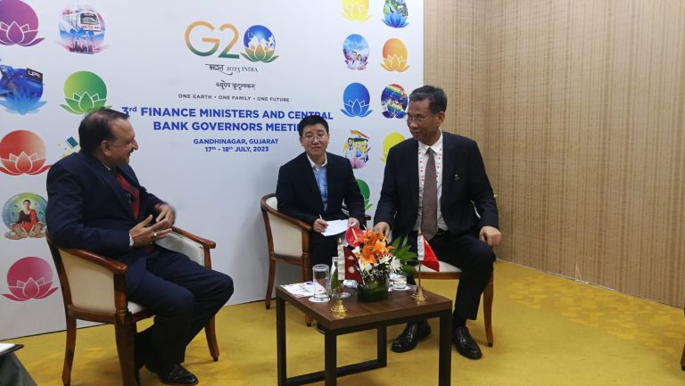 भारतको गुजरात राज्यको गान्धीनगरमा भइरहेको जी २० अर्थमन्त्री स्तरीय बैठकको क्रममा अर्थमन्त्री डा महत र चिनियाँ अर्थमन्त्री लिउ बीच भेटवार्ता भएको हो । द्विपक्षीय वार्तामा दुई देशबीच ऐतिहासिक र सहयोगात्मक सम्बन्ध रहेको कुरा दुवै मन्त्रीहरूले व्यक्त गरेका छन् ।