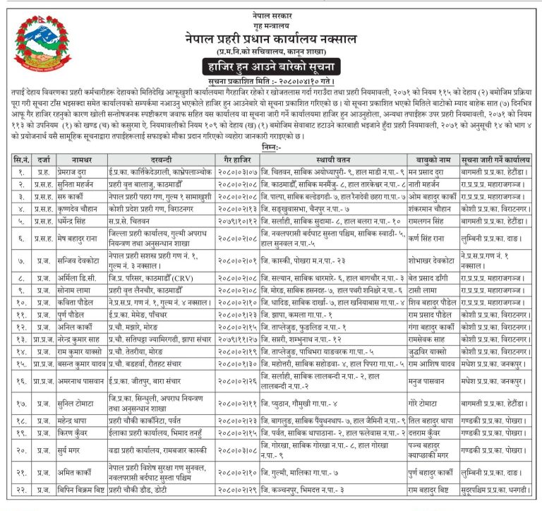 प्रहरी प्रधान कार्यालयले आज एक सूचना जारी गर्दै गैरहाजिर हुनुको कारण खुल्ने सन्तोषजनक स्पष्टीकरणसहित सात दिनभित्र उपस्थित नभए ती प्रहरी कर्मचारीहरूलाई प्रहरी नियमावलीको नियम १०९ को देहाय (ख) १ बमोजिम सेवाबाट हटाउने प्रहरी प्रधान कार्यालयले जनाएको छ।