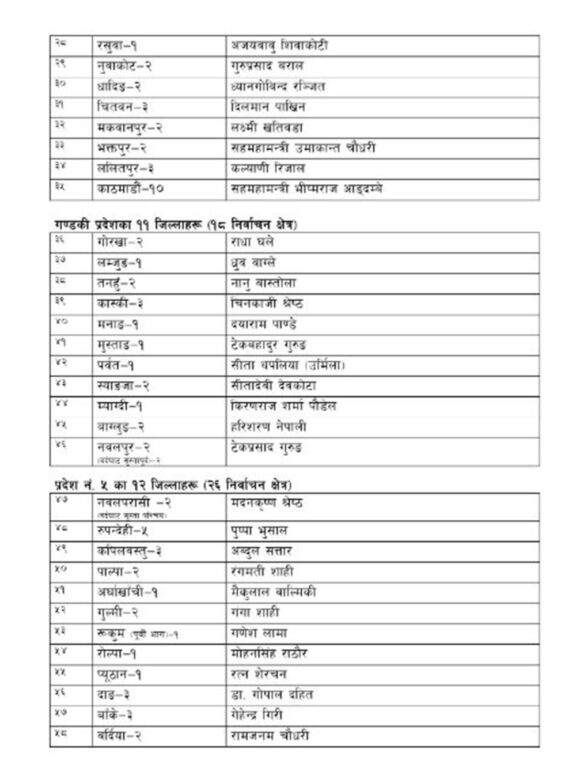 कोशी प्रदेशको ताप्लेजुङ–१ मा सुजनता परियार, पाँचथर–१ लक्ष्मी परियार, इलाम–२ डा.डिला सङ्ग्रौला, मधेस प्रदेशको सप्तरी–४ मा आनन्दप्रसाद ढुङ्गाना र सिरहा–४ मा राजीव ढुङ्गानालगायत छन् ।