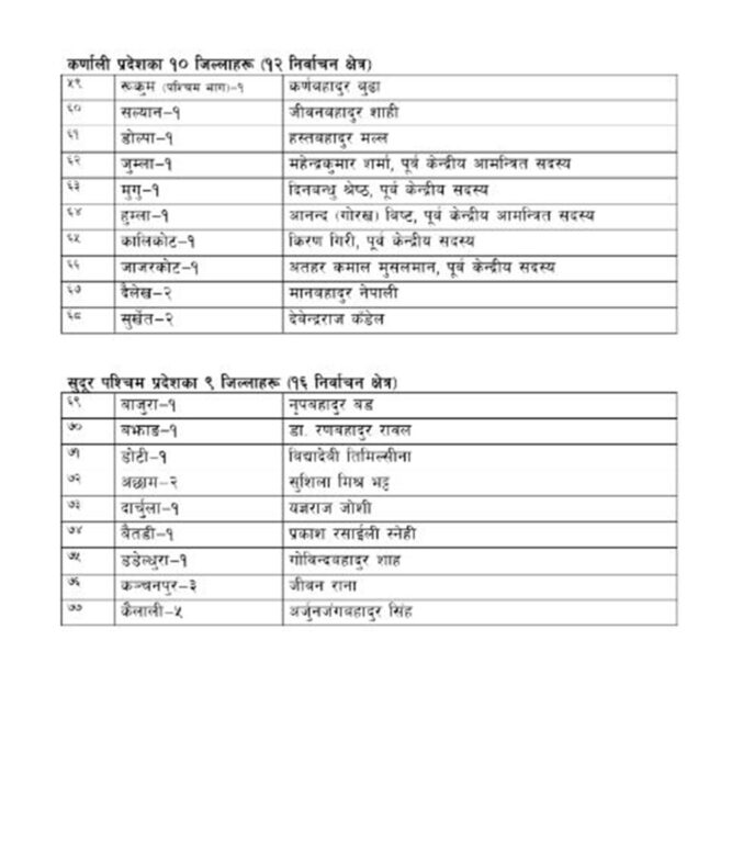 कांग्रेसले पाँच जना केन्द्रीय सदस्यबाहेकलाई पनि जिल्लामा खटाएको छ भने प्रतिनिधि र प्रदेशसभाका सांसद बाहेकका केन्द्रीय सदस्यलाई जिम्मेवारी तोकिएको छ ।