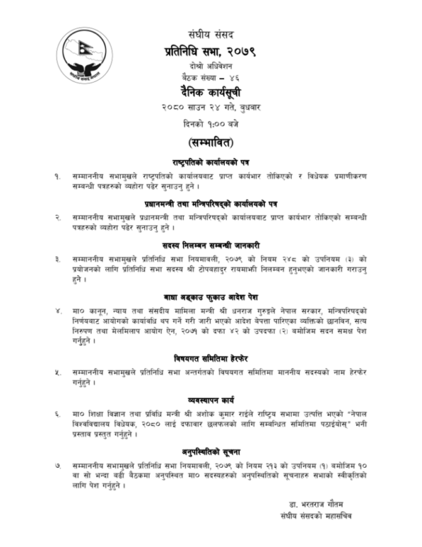 आजको बैठकमा राष्ट्रपति कार्यालयबाट प्राप्त कार्यभार तोकिएको र विधेयक प्रमाणीकरण सम्बन्धी पत्रहरूको ब्यहोरा पढेर सुनाउने तथा प्रधानमन्त्री तथा मन्त्रिपरिषद् कार्यालयबाट प्राप्त कार्यभार तोकिएको पत्र पढेर सुनाइने कार्यसूची रहेको छ ।