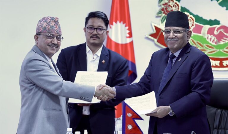 काठमाडौं । प्रधानमन्त्री पुष्पकमल दाहाल ‘प्रचण्ड’ र विभागीय मन्त्रीबीच सरकारको चालु आवको वार्षिक नीति तथा कार्यक्रम र बजेट कार्यान्वयनका सम्बन्धमा कार्यसम्पादन सम्झौता भएको छ । सिंहदरबारस्थित प्रधानमन्त्री तथा प्रधानमन्त्री कार्यालयमा आज आयोजित कार्यक्रममा प्रधानमन्त्री दाहाल र २१ मन्त्रालयका विभागीय मन्त्रीबीच कार्यसम्पादन सम्झौता भएको हो ।