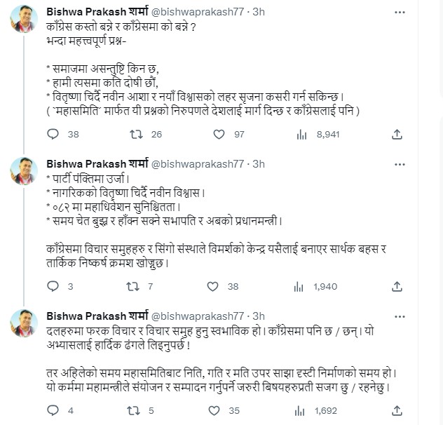 पहिलो ट्विटमा शर्माले महासमितिमार्फत कांग्रेसमाथि उठेका विभिन्न प्रश्नको जवाफ खोजिने बताएका छन् ।