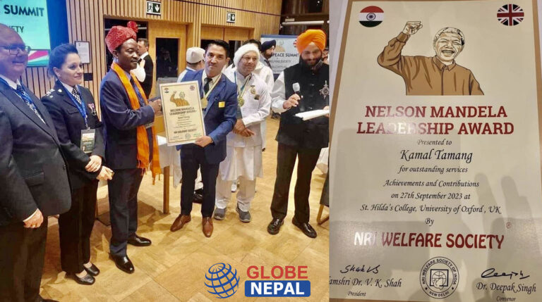काठमाडौं । ओखलढुंगा जिल्लाको सुनकोशी गाउँपालिका अध्यक्ष कमल तामाङ बेलायतको अक्सफोर्ड युनिर्भसिटीले प्रदान गर्ने ‘नेल्सन मन्डेला लिडरसिप अवार्ड २०२३’ बाट सम्मानित भएका छन् । अक्सफोर्ड युनिर्भसिटीमा सेप्टेम्बर २७ का दिन आयोजना भएको ‘ग्लोबल पिस समिट’ मार्फत अध्यक्ष तामाङ अवार्डले सम्मानित भएका हुन् । यो अवार्ड पाउने तामाङ सम्भवतः नेपालकै पहिलो हुन् ।