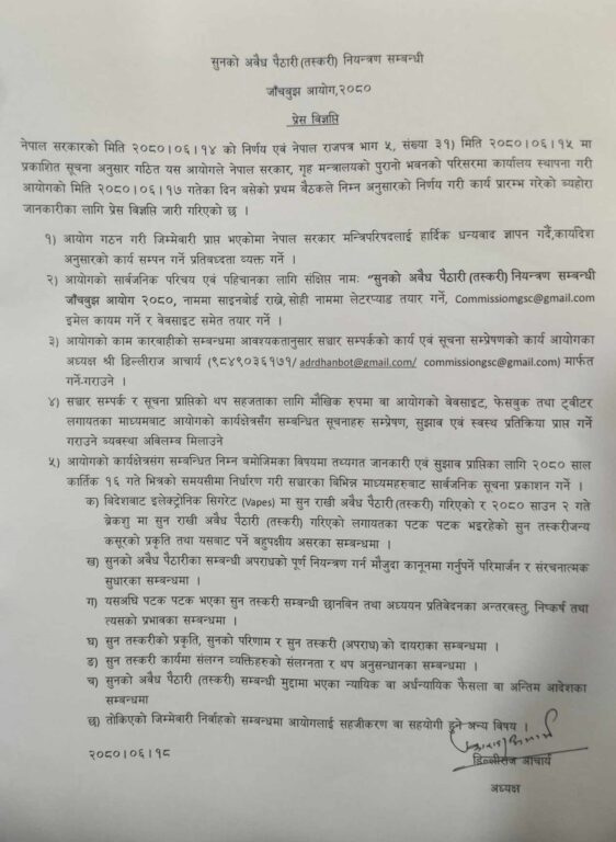 काठमाडौं । सरकारले गठन गरेको ‘सुनको अवैध पैठारी (तस्करी) नियन्त्रण सम्बन्धी जाँचबुझ आयोग–२०८०’ ले आफ्नो काम थालेको छ । बिहीबार सिंहदरबारमा पत्रकार सम्मेलन गरेर आयोगका अध्यक्ष डिल्लीराज आचार्यले कार्य प्रारम्भ भएको जानकारी गराएका हुन् ।