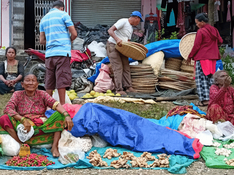 शनिबारे हाटबजारमा दसैँ नजिकिएकाले खसी व्यापारीको भीड थियो। कपडा, भाँडाकुँडा, तरकारी व्यापारीलगायत ठूलो लगानीमा ठूलै व्यापार गर्ने व्यापारी थिए। सेवाग्राहीको उस्तै खचाखच। त्यही भीडमा निलो प्लाष्टिक बिच्छ्याएर अदुवा, लसुन, गुन्द्रुक, जिरे खुर्सानी भाग–भाग लगाएर उनी बेच्न बसेकी थिइन्।