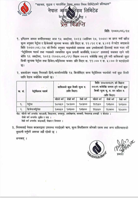 नयाँ मूल्यअनुसार पेट्रोलको पहिलो वर्गमा प्रतिलिटर १६९.५, दोस्रो वर्गमा १७१ र तेस्रो वर्गमा १७२ रुपैयाँ कायम भएको छ । त्यस्तै, डिजेलको प्रतिलिटर डिजेलको पहिलो वर्गमा १६्५.५, दोस्रो वर्गमा १६७ र तेस्रो वर्गमा १६८ रुपैयाँ भएको छ ।