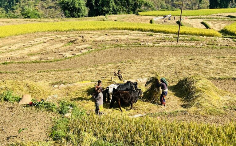 भादगाउँ । भक्तपुरका किसानलाई यतिखेरि धान भित्र्याउन चटारो छ । एकातिर किसानका घरआँगन, कौसी तथा चोकचोकमा धान सुकाउनेको लर्को लागेको छ भने अर्कोतर्फ कोही खेतमा पाकेर पहेँलपुर भएको धान काट्ने, झार्ने र घर ल्याउने कार्यमा व्यस्त छन् ।