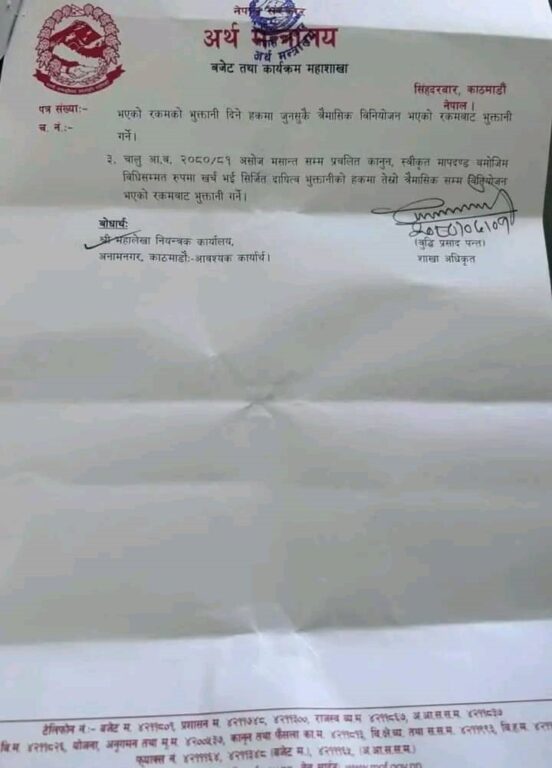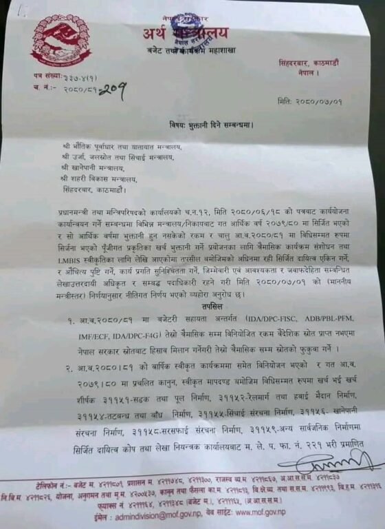 निर्माण व्यवसायीको भुक्तानी पाउने गरी अर्थ मन्त्रालयले नीतिगत निर्णय गरेर सम्बन्धित कार्यालयहरुमा परिपत्र गरिसकेको छ । उक्त भुक्तानी दशैं अघि नै निर्माण व्यवसायीका खातामा जाने गरी व्यवस्था गरिएको अर्थ मन्त्रालयको भनाइ छ ।