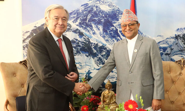 काठमाडौं । संयुक्त राष्ट्रसङ्घका महासचिव एन्टोनियो गुटेरेस र राष्ट्रियसभा अध्यक्ष गणेशप्रसाद तिमिल्सिनाबीच भेटवार्ता भएको छ । सिंहदरवारस्थित सङ्घीय संसद सचिवालयमा रहेको राष्ट्रियसभा अध्यक्षको कार्यकक्षमा उनीहरुबीच भेटवार्ता भएको हो ।