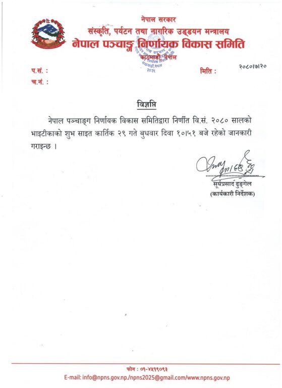 नेपाल पञ्चाङ्ग निर्णायक विकास समितिले यस वर्षको भाइटीकाको साइत कात्तिक २९ गते बिहान १० बजेर ५१ मिनेट जाँदा तय गरेको कार्यकारी निर्देशक सूर्यप्रसाद ढुंगेलले जारी गरेको विज्ञप्तिमा उल्लेख छ ।