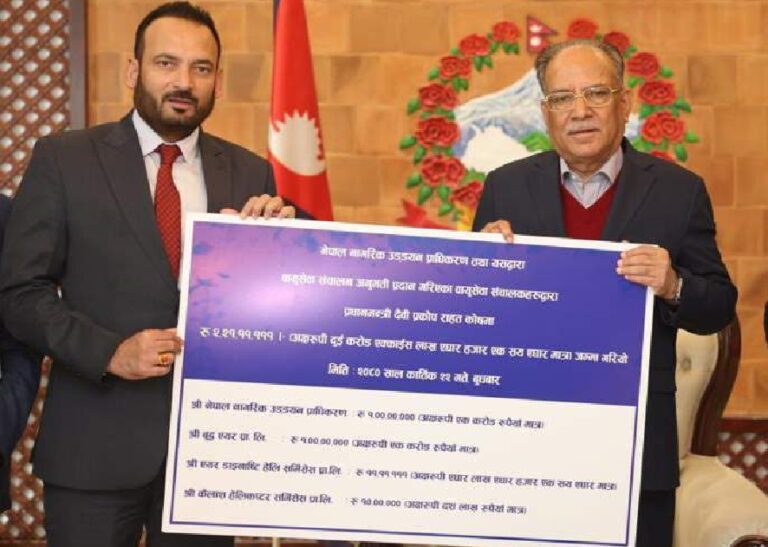 प्राधिकरणका महानिर्देशक प्रदीपकुमार अधिकारीलगायत कर्मचारी बालुवाटार पुगेर प्रधानमन्त्री पुष्पकमल दाहाल ‘प्रचण्ड’ लाई आज बिहान उक्त रकम बराबरको चेक प्रधानमन्त्री दैवी प्रकोप उद्धार कोषका लागि हस्तान्तरण गरेकाे नेपाल नागरिक उड्डयन प्राधिकरण (क्यान) का प्रवक्ता जगन्नाथ निरौलाले जानकारी दिए ।