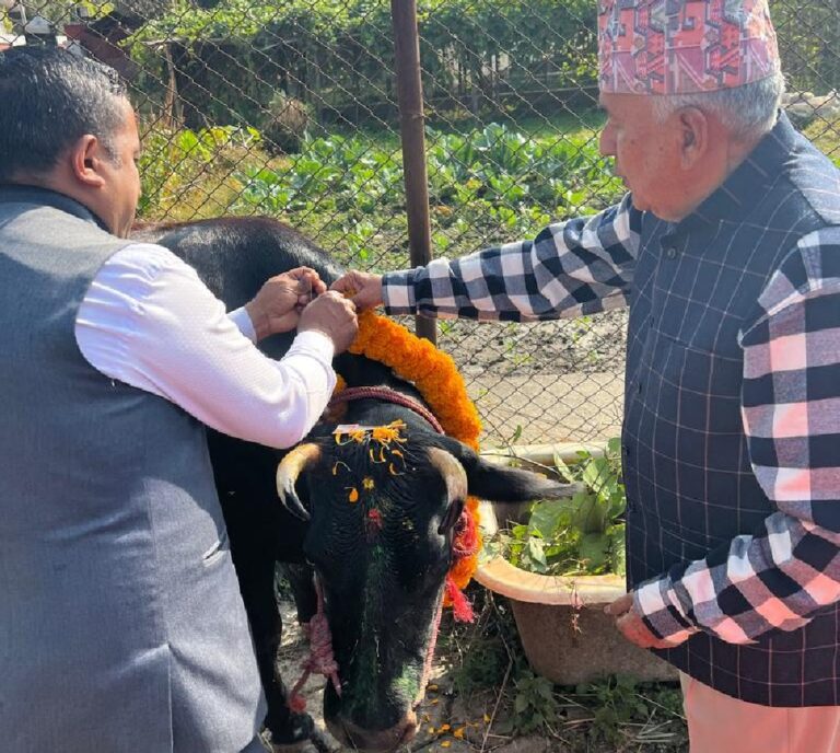राष्ट्रपति पौडेलले शीतल निवासमा विधिपूर्वक गाईको पूजा गरी गाईलाई खानेकुरा खान दिएका हुन् ।