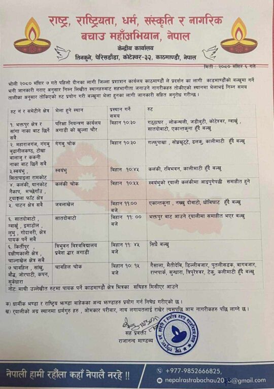 मङ्सिर ७ गते काठमाडौँ उपत्यकाका विभिन्न स्थानहरूमा नेकपा एमाले निकट युवा संघ नेपाल र मेडिकल ब्यावसायी दुर्गा प्रसाईको समुहले र्याली र जुलुसका साथै विरोध प्रदर्शन गर्ने भएकाले काठमाडौँ उपत्यका भरी सवारी आवागमनमा असहजता सिर्जना हुन सक्ने ट्राफिक कार्यालयले जनाएको छ ।