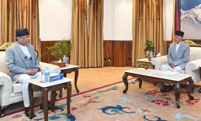काठमाडौँ । प्रधानमन्त्री पुष्पकमल दाहाल ‘प्रचण्ड’ ले राष्ट्रपति रामचन्द्र पौडेलसँग भेटवार्ता गरेका छन्। मंगलबार बिहान शितल निवास पुगेर प्रधानमन्त्री दाहालले राष्ट्रपति पौडेलसँग भेटवार्ता गरेका हुन्।