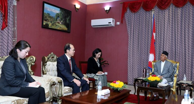 काठमाडौँ । राष्ट्रपति रामचन्द्र पौडेलसँग नेपालका लागि जापानका राजदूत किकुता युताकाले आज राष्ट्रपति भवनमा शिष्टाचार भेट गरेका छन् ।