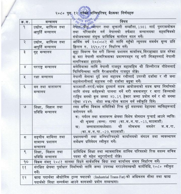 मन्त्रिपरिषद् बैठकका १२ निर्णय :